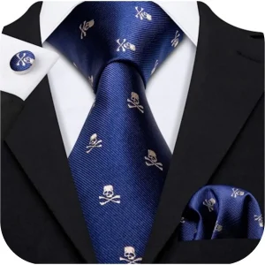 Kit Gravata Executiva Caveira Seda Azul + Lenço Abotoaduras