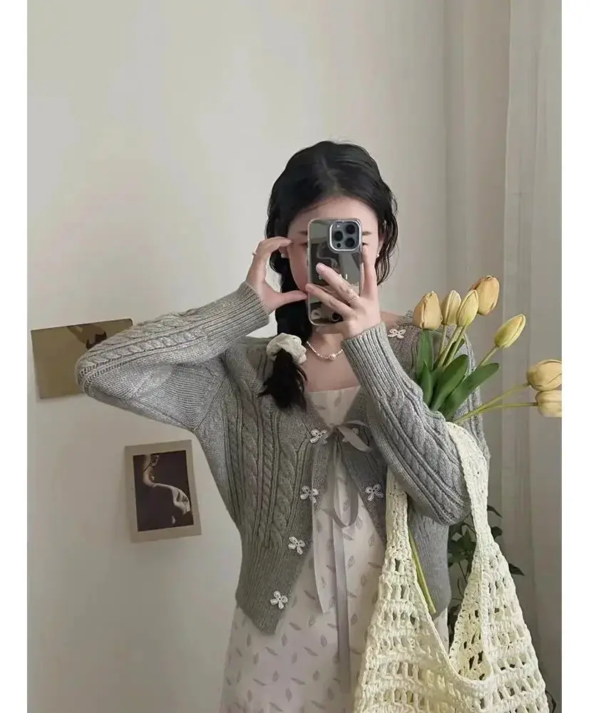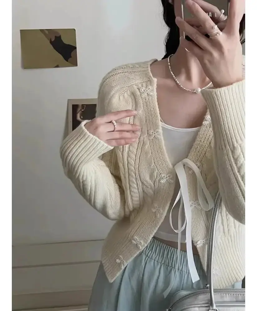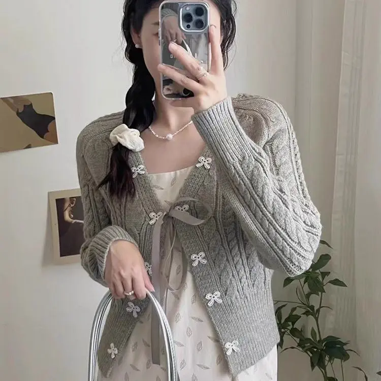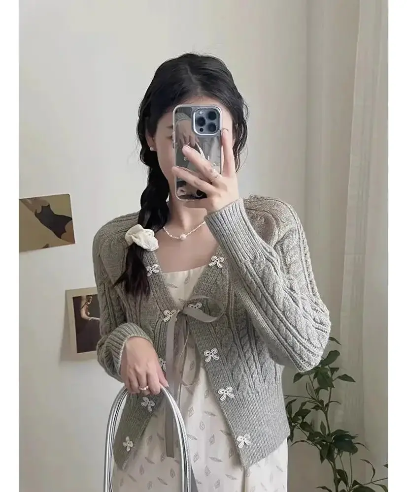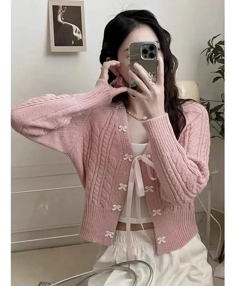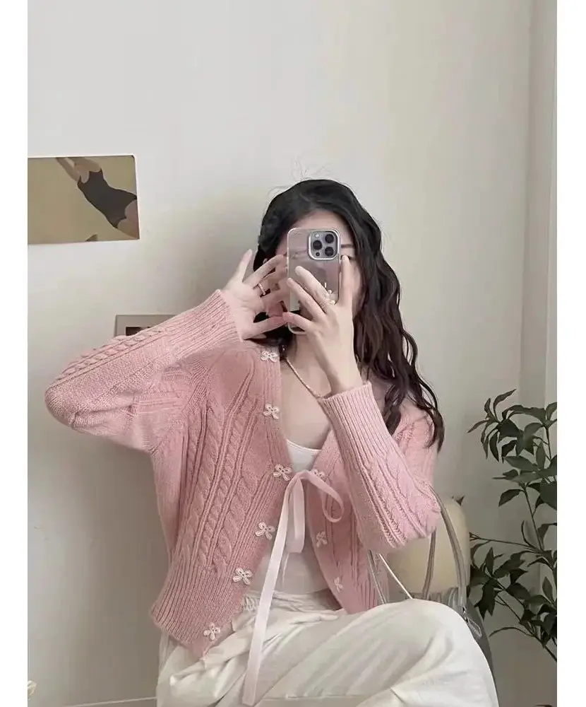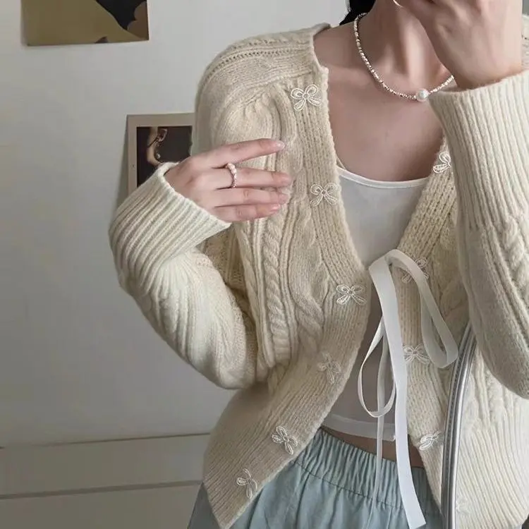 Eleve seu guarda-roupa de outono com este deslumbrante cardigan de malha com arco de estilo coreano. Projetado para versatilidade e conforto, é a adição perfeita à sua coleção.