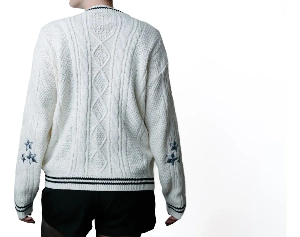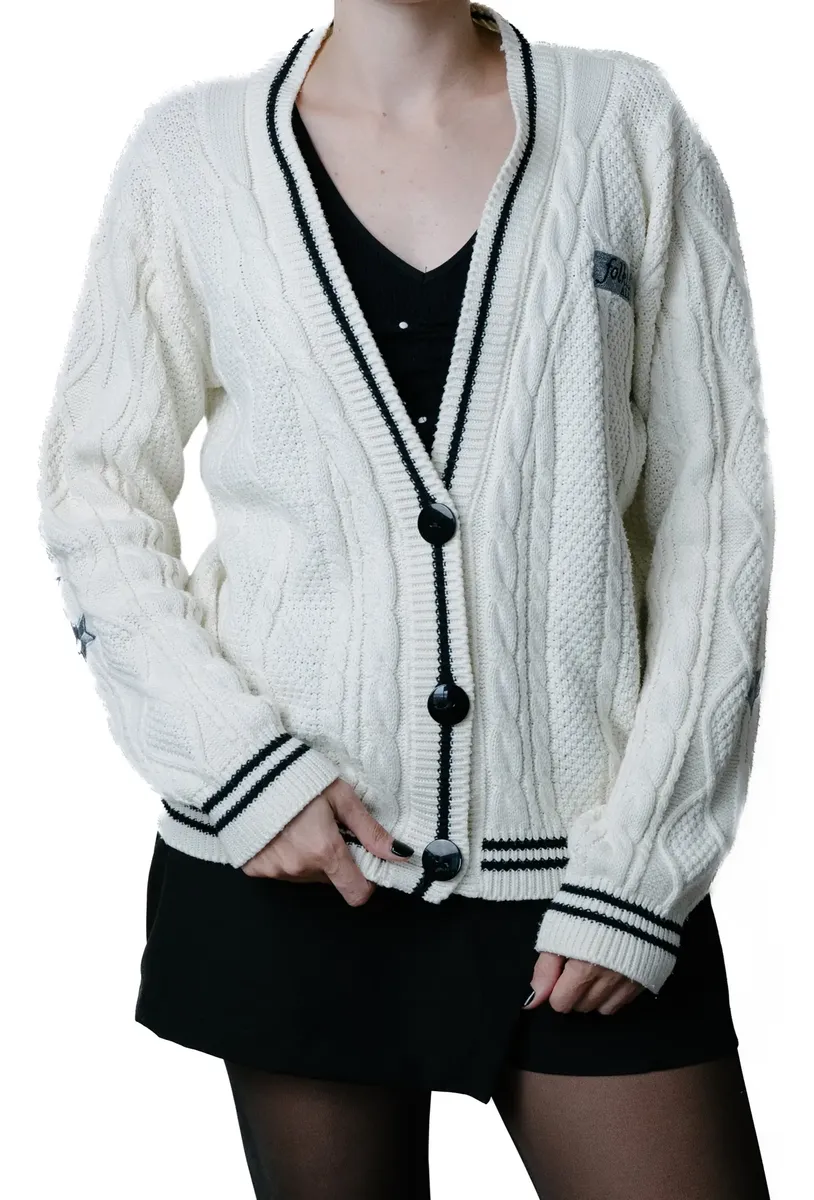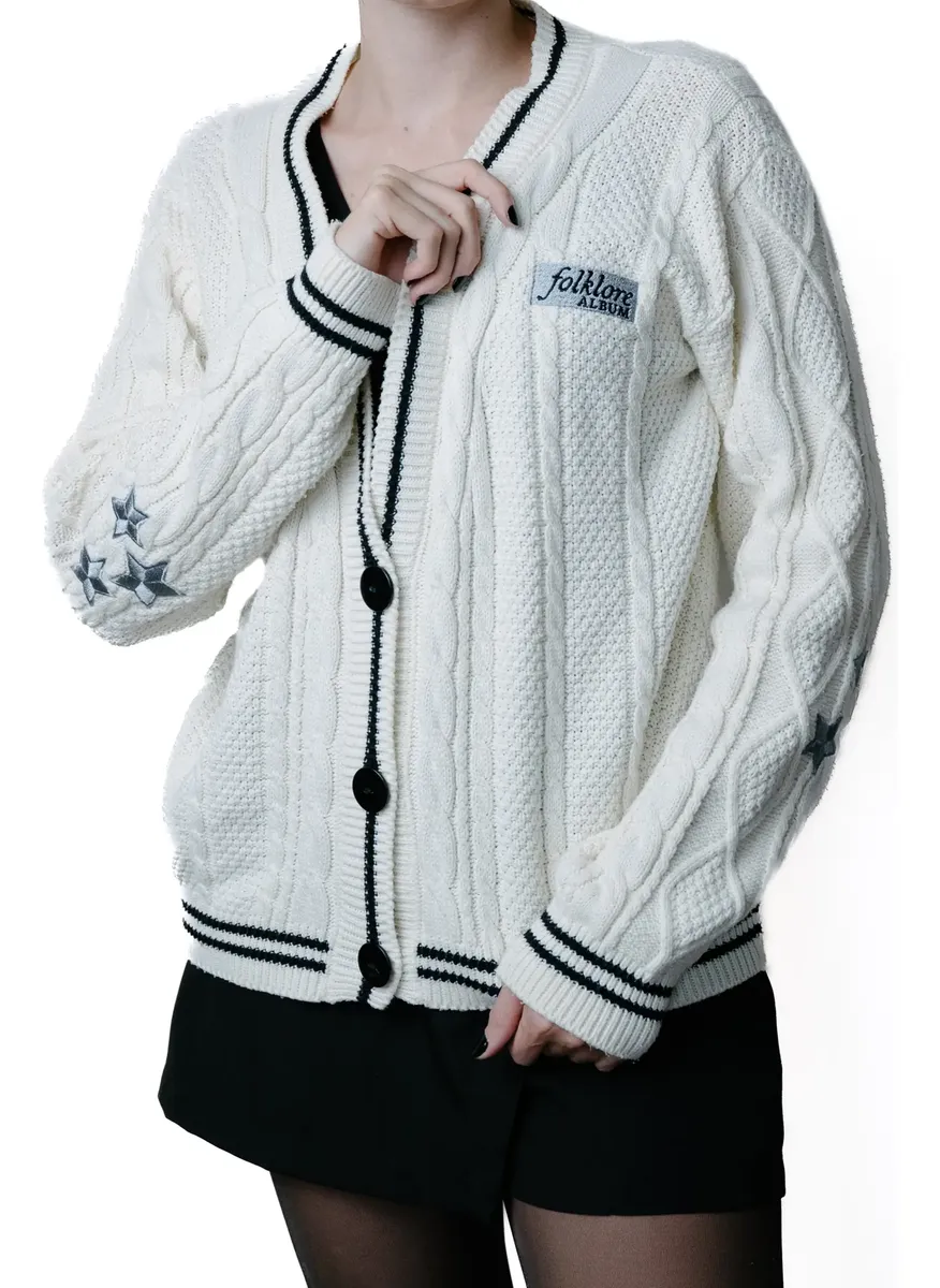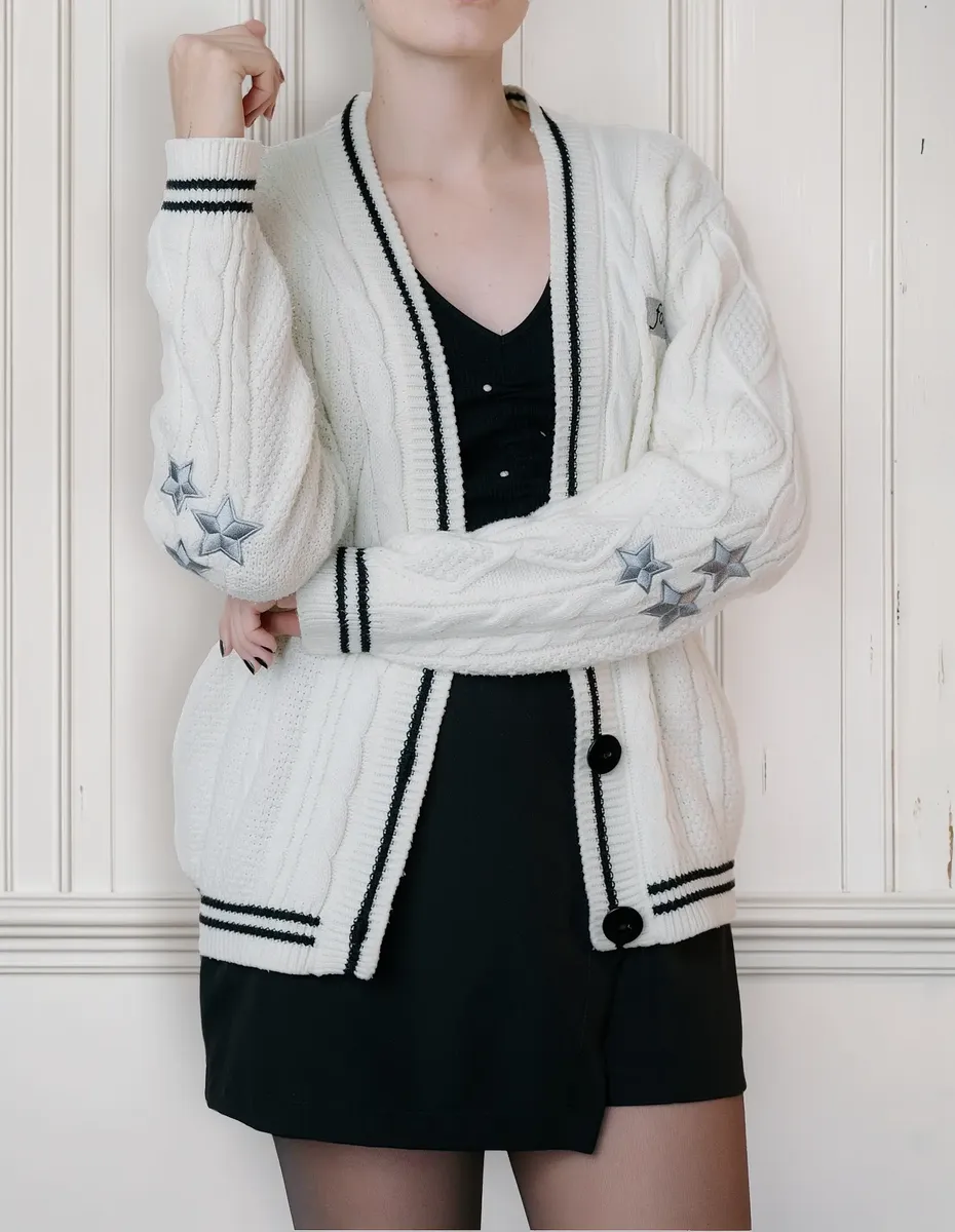 Cardigan cor creme com acabamento e botões pretos, bordado de estrela em cinza claro acetinado nos dois braços. Logo bordado cinza acetinado e preto no peito esquerdo.