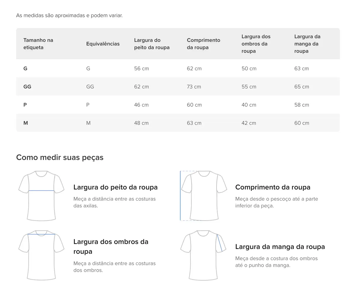 Tamanho P com as medidas abaixo: