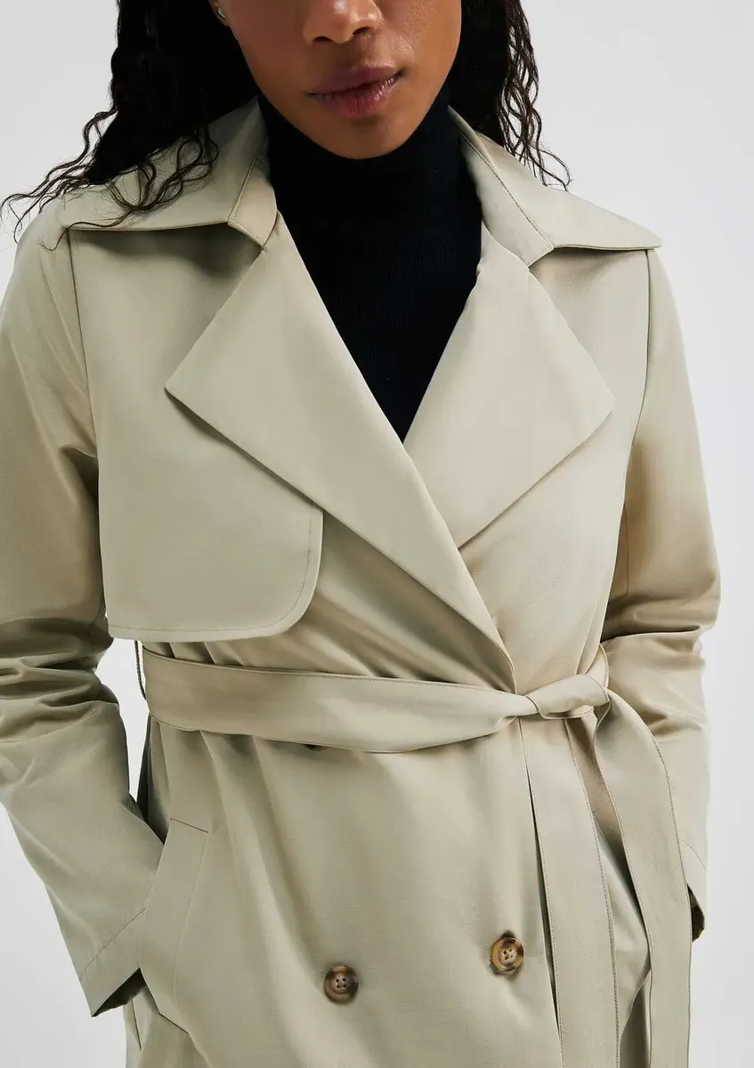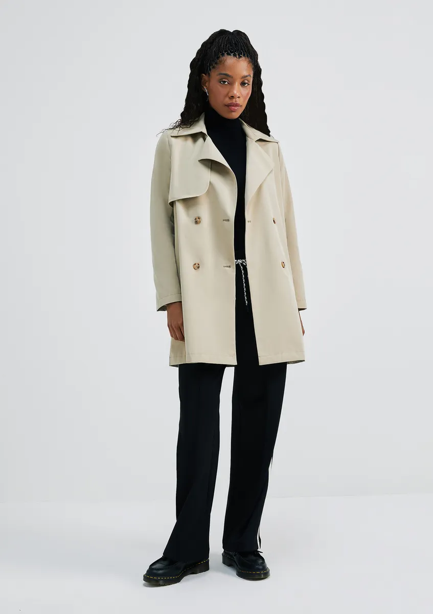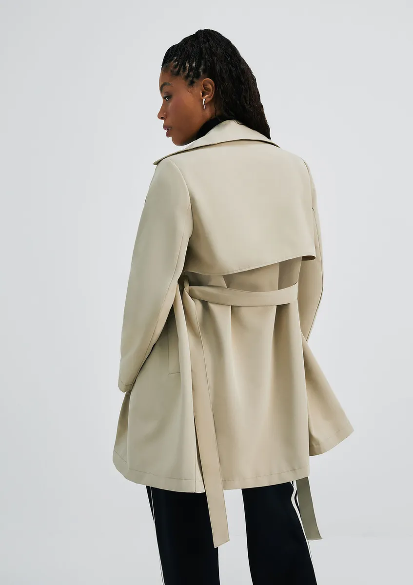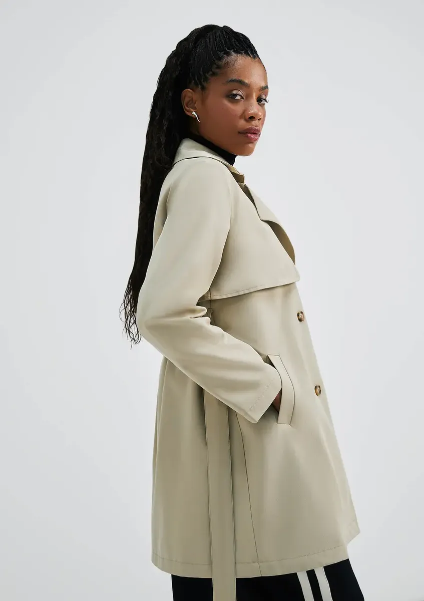 O casaco estilo Trench Coat é um item essencial e atemporal que não pode faltar em nenhum guarda-roupa. Feito em tecido resistente à água com um forro acetinado, este casaco possui uma silhueta elegante e sofisticada. Sua cintura é destacada por um cinto faixa removível, adicionando um toque