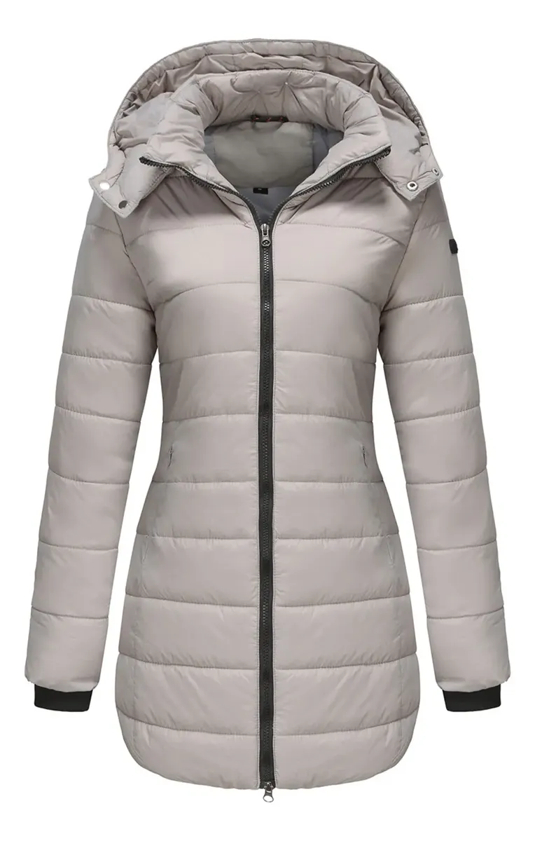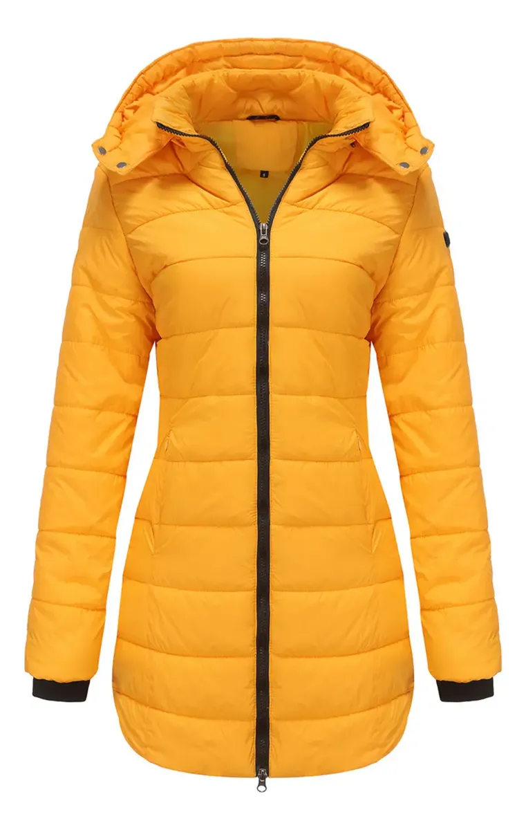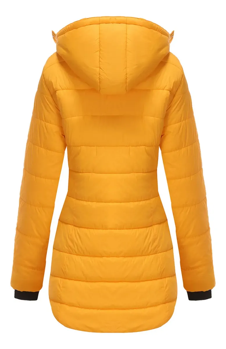 Jaqueta feminina casual de comprimento médio e quente de algodão com capuz de cor sólida