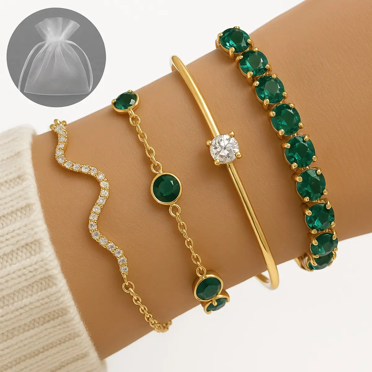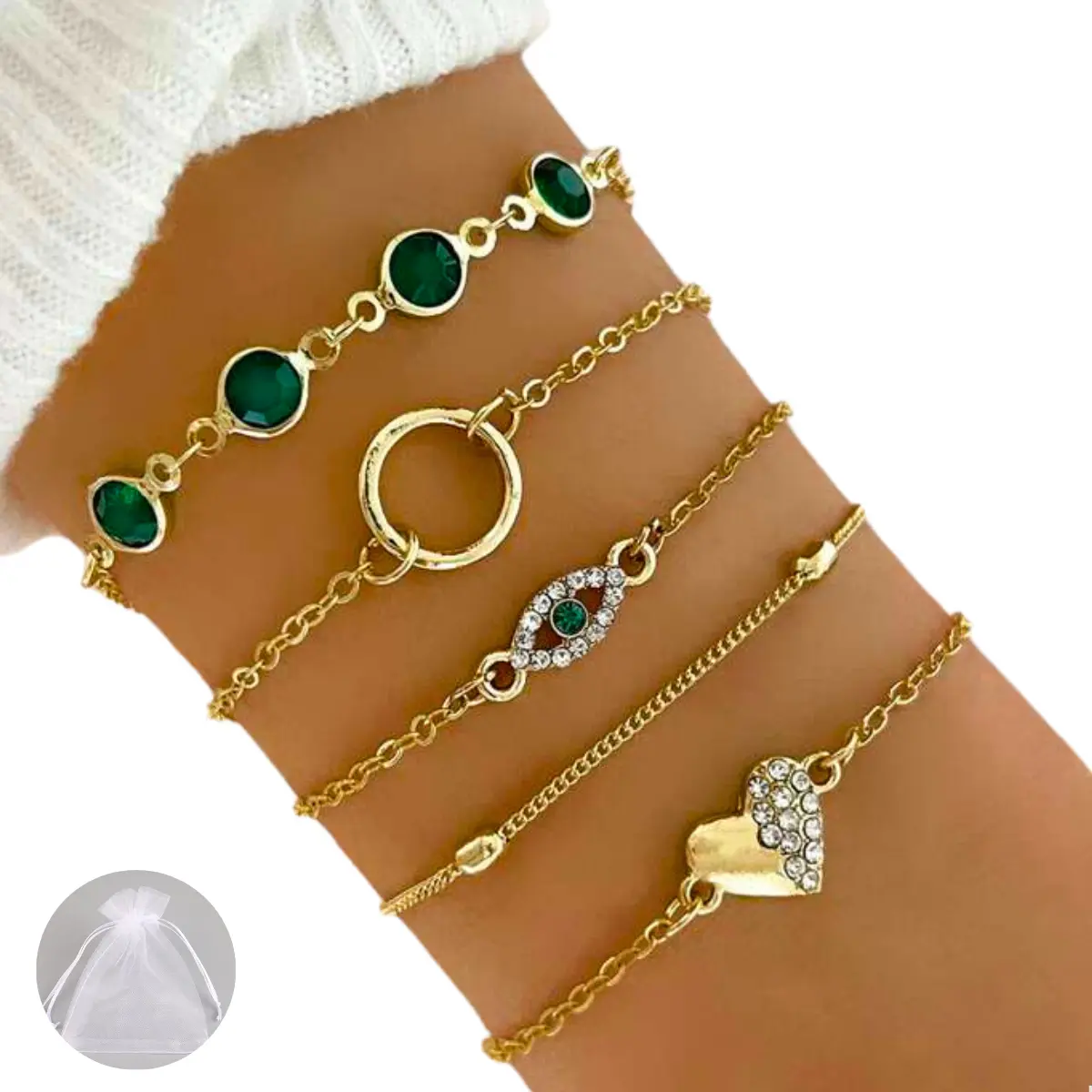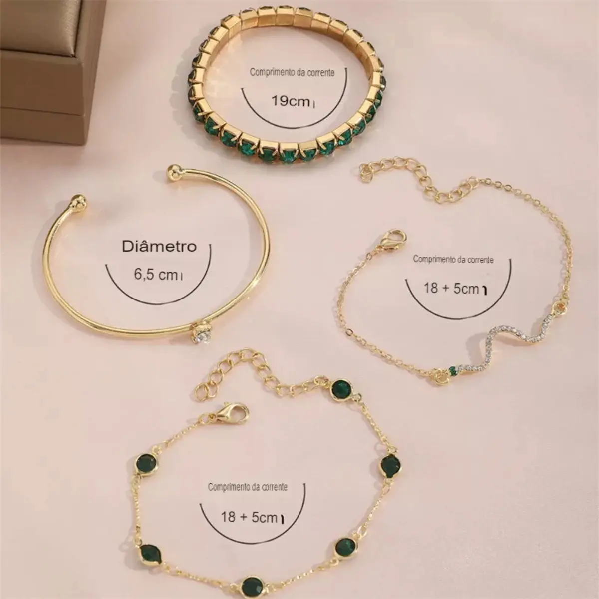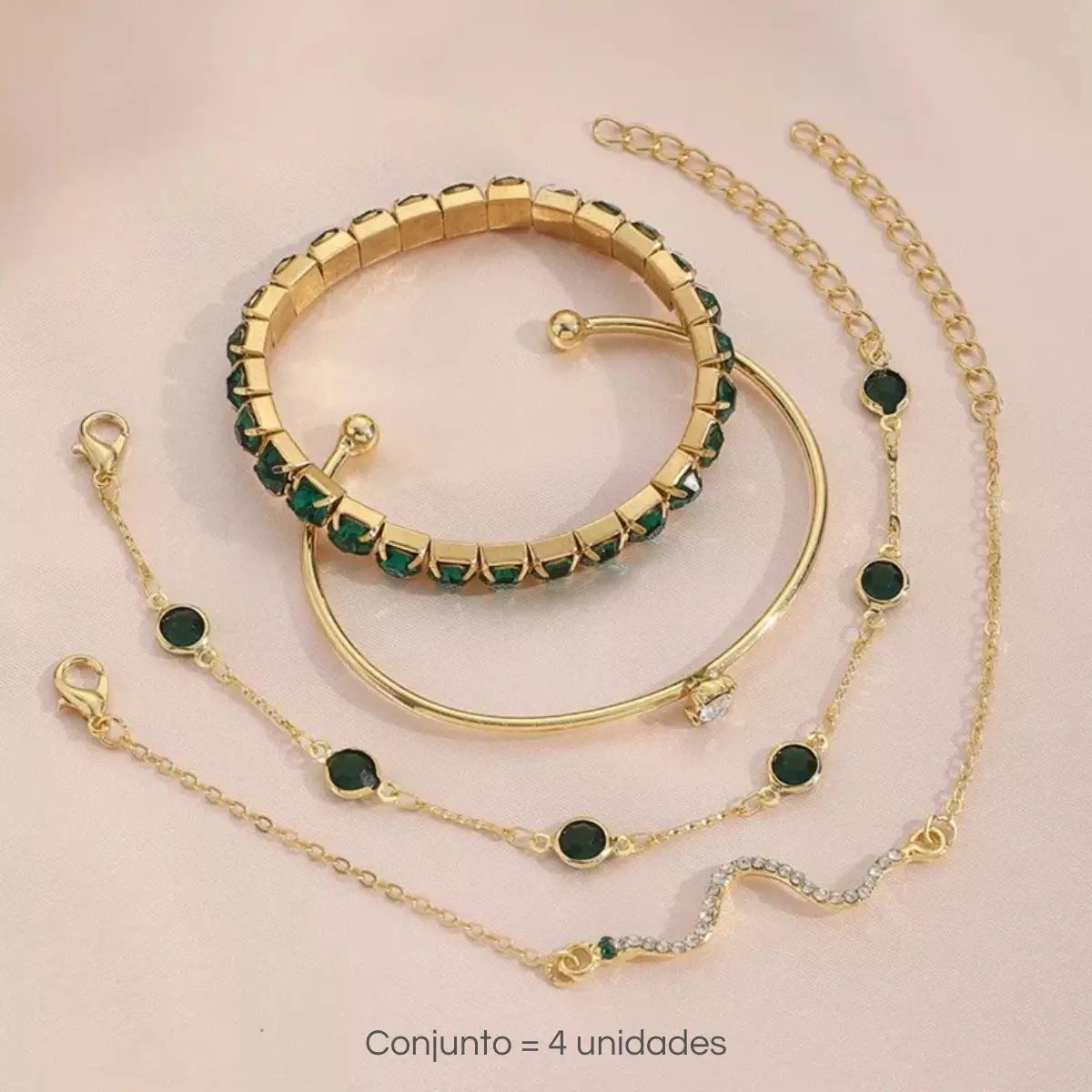 Conjunto 4 Peças Pulseira Bracelete Feminina Dourada E Verde