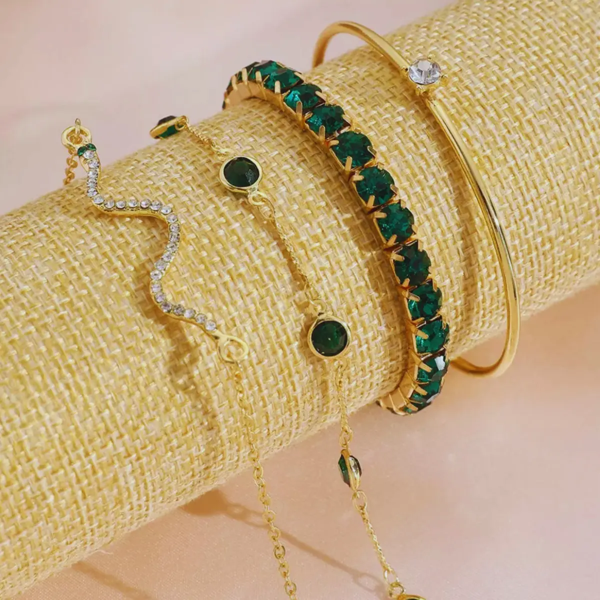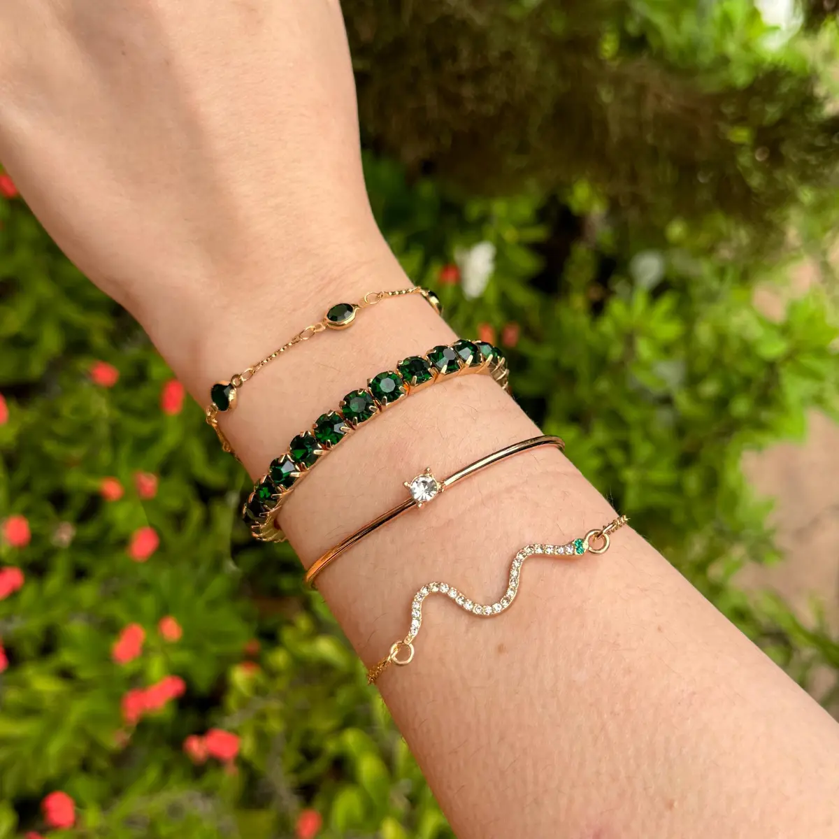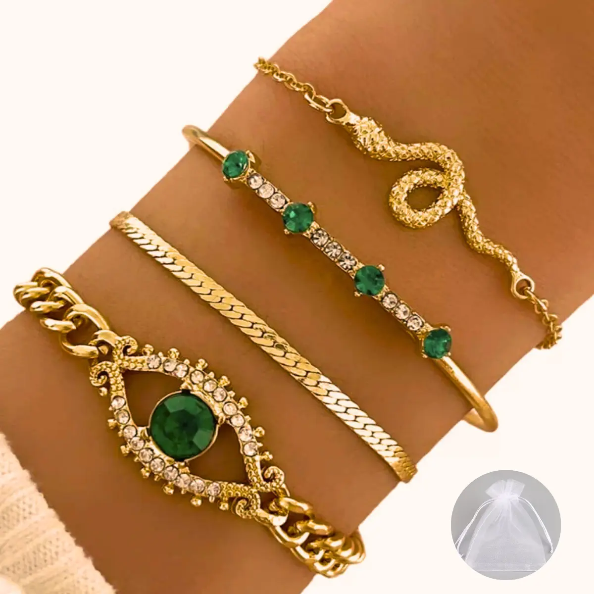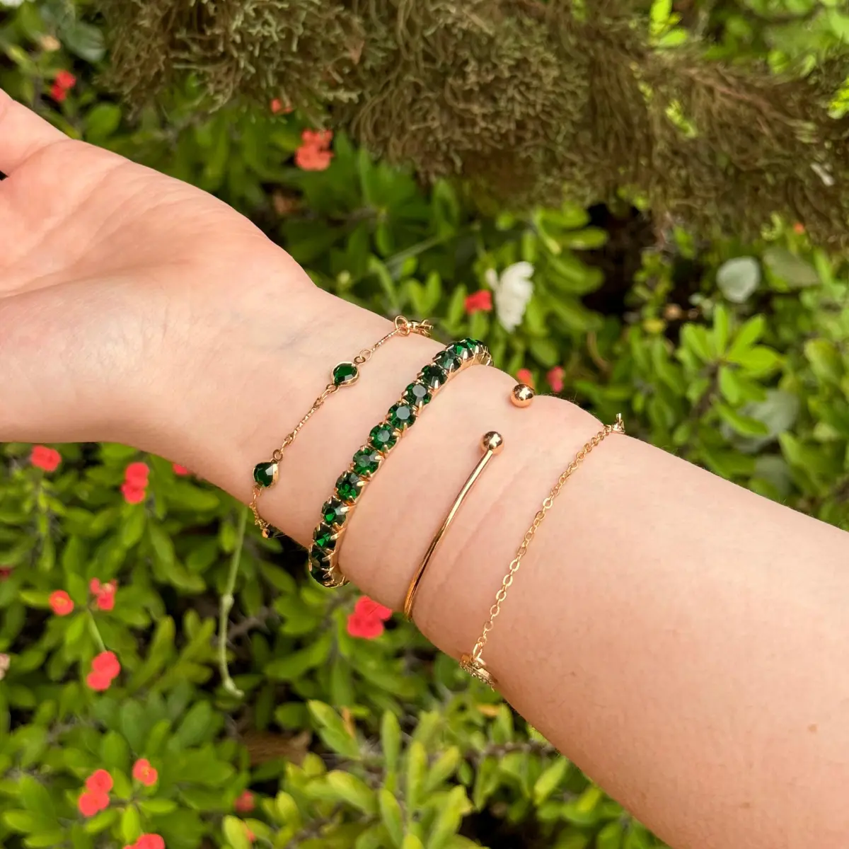 Conjunto 4 Peças Pulseira Bracelete Feminina Dourada E Verde