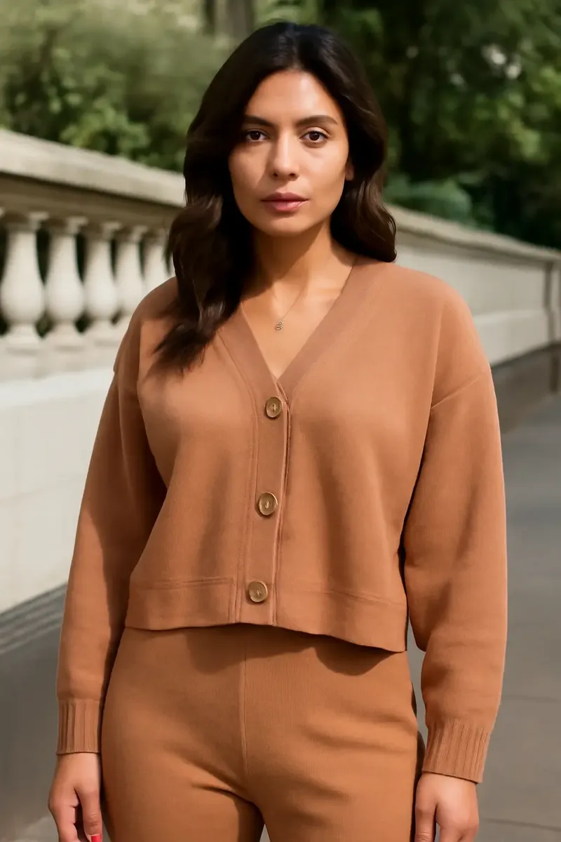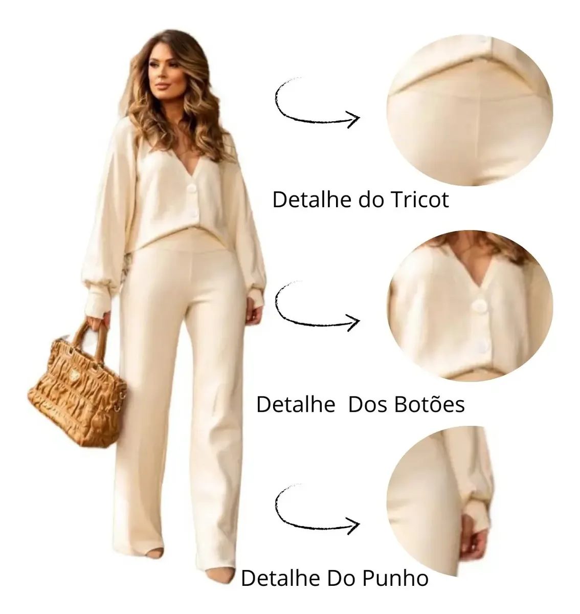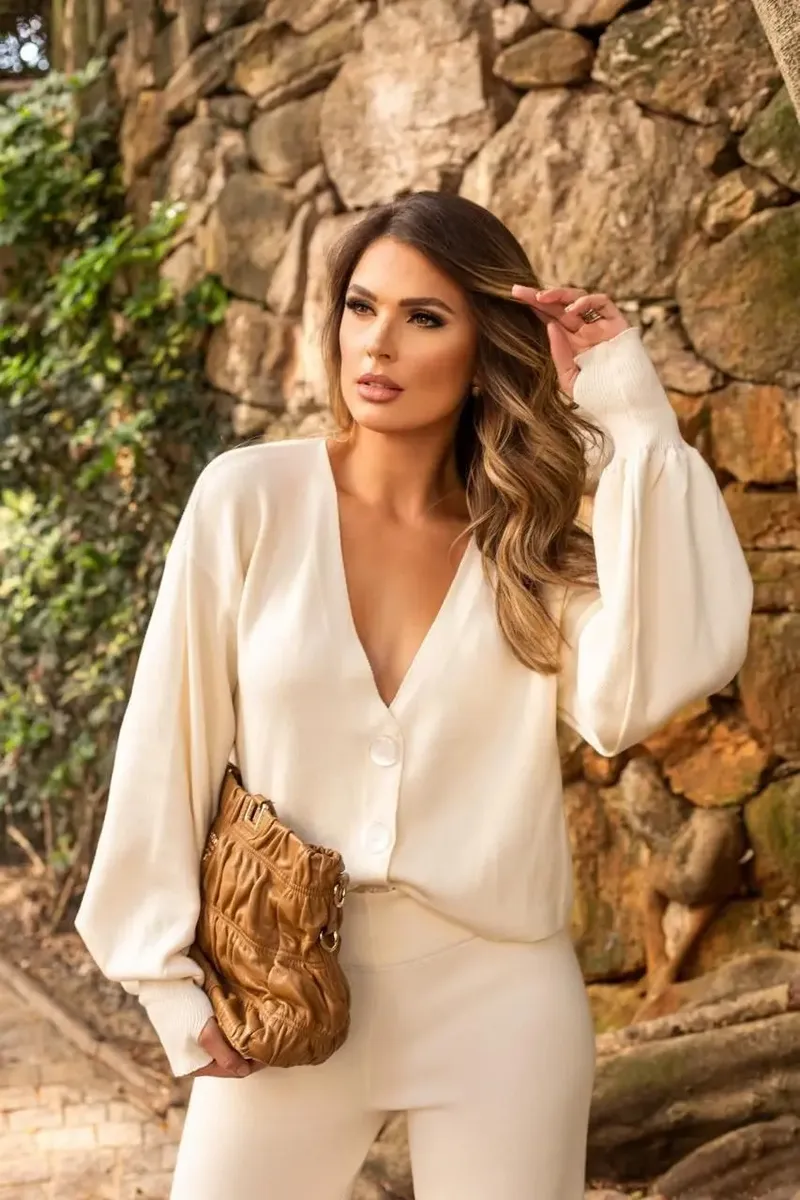 Conjunto Blusa De Dedinho Cardigan Botão Calça Tricot Modal