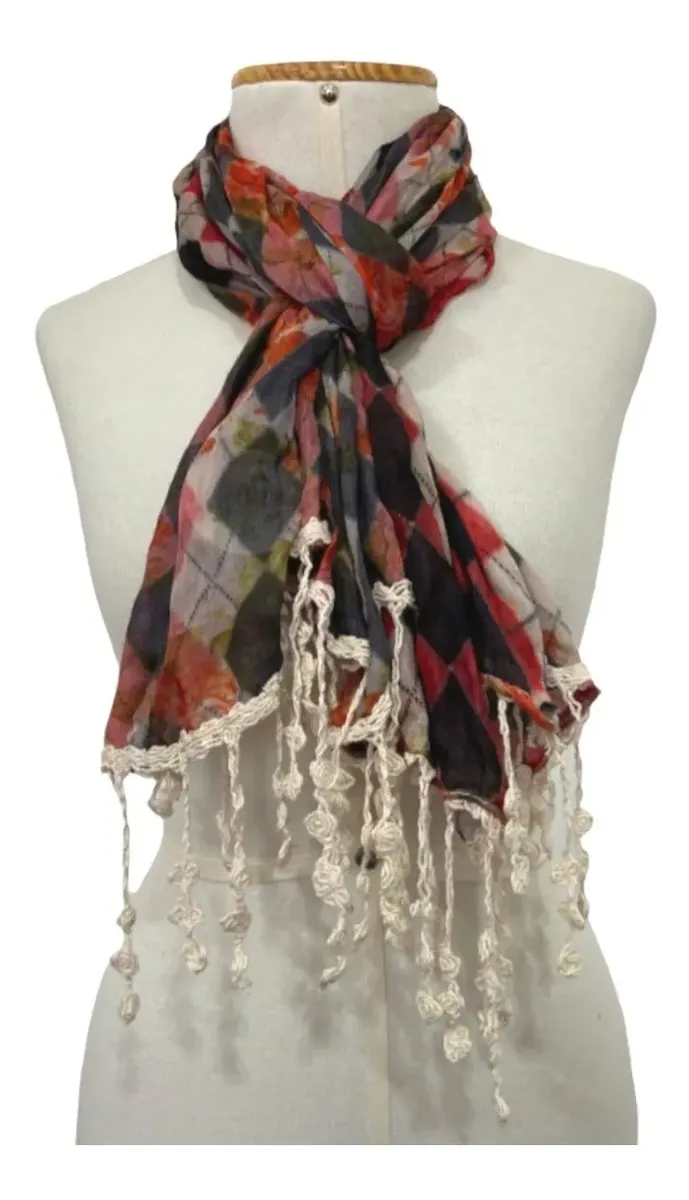 Linda e Delicada Echarpe Dupla Face Com Franjas Em Crochet Feito à Mão, Efeito Amassadinho