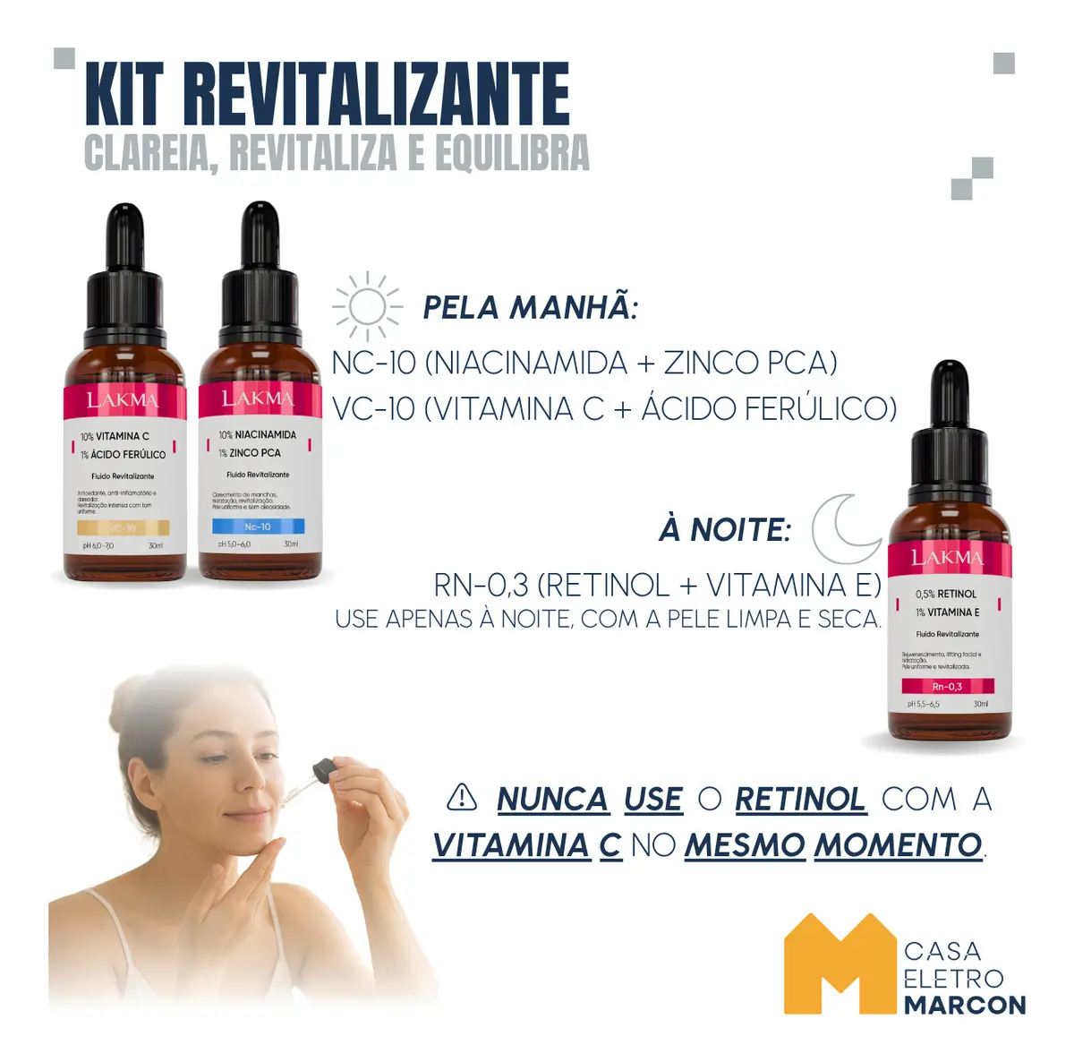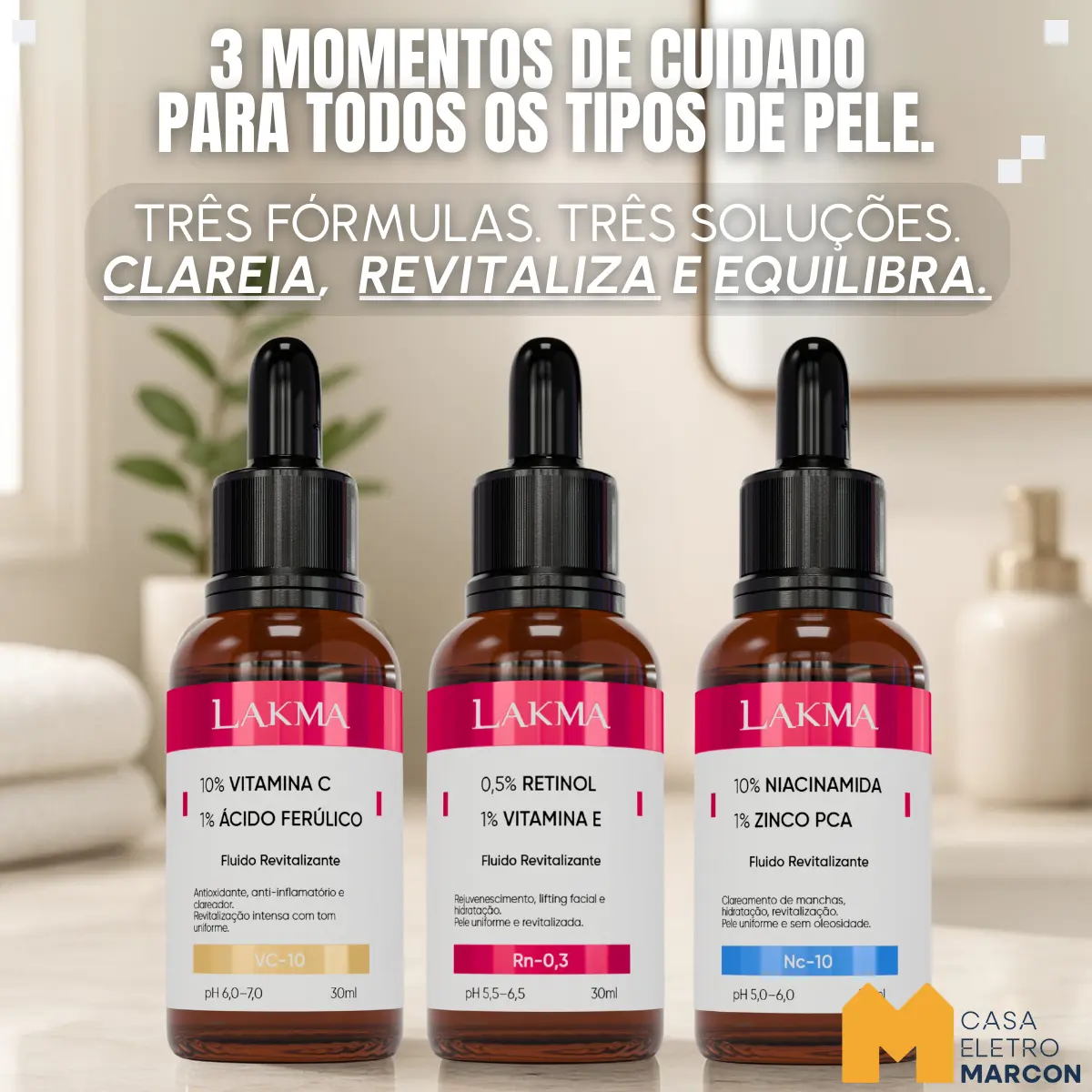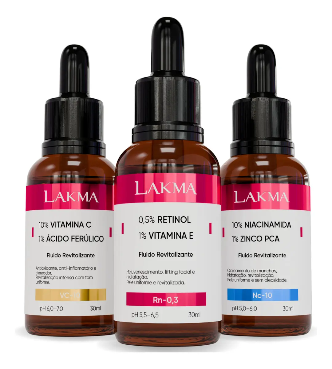 KIT REVITALIZANTE LAKMA – Vitamina C 10%, Niacinamida 10% e Retinol 0,5% (3x30ml)