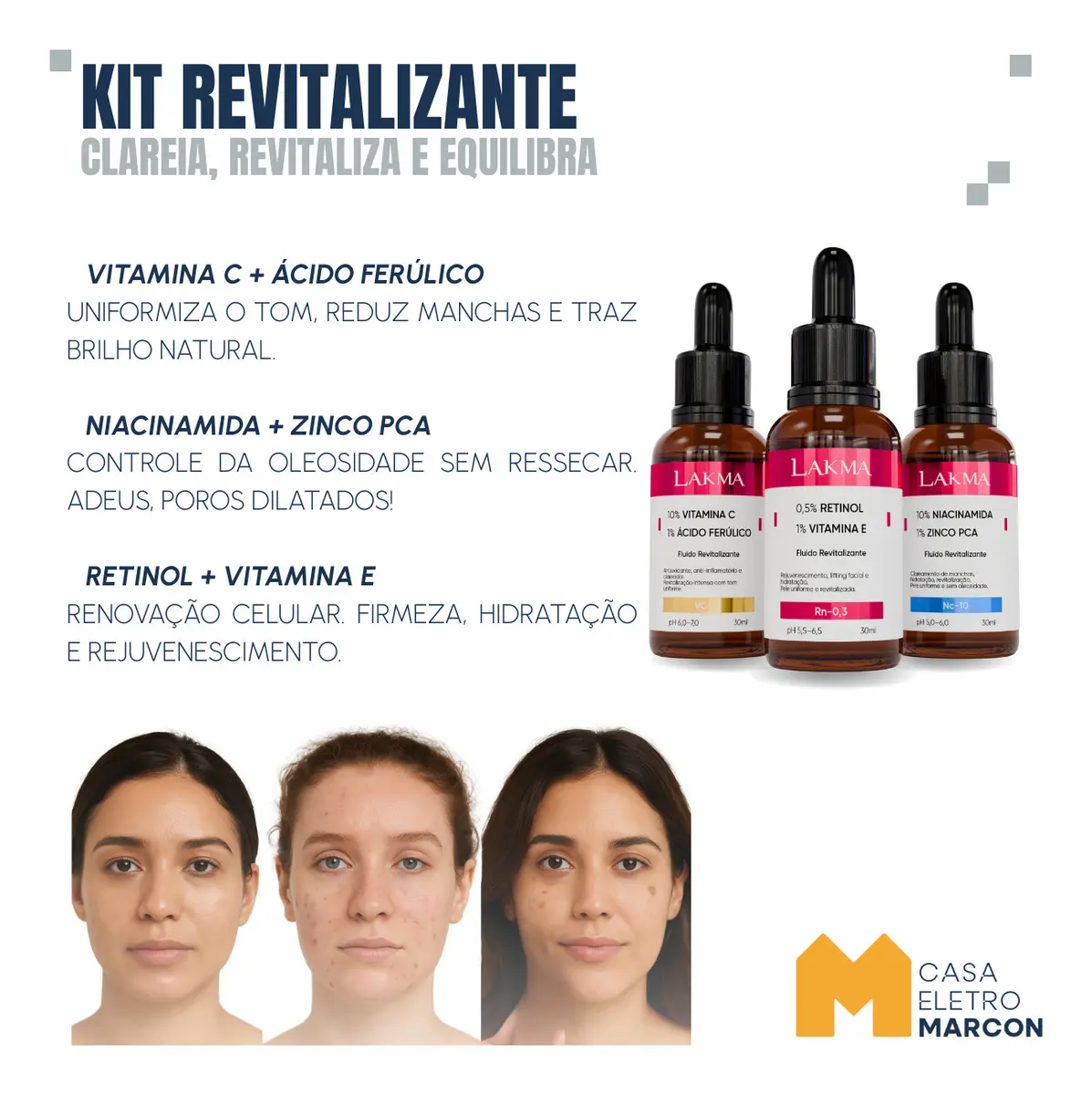 O Kit Revitalizante Lakma foi desenvolvido para entregar resultados reais com ativos consagrados da dermatologia. A combinação dos três séruns atua em sinergia para renovar a pele, controlar a oleosidade, uniformizar o tom e combater sinais de envelhecimento.