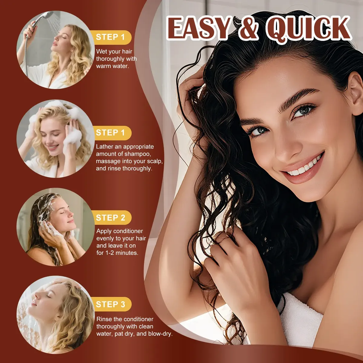 Shampoo: molhe bem o cabelo com água morna, aplique uma quantidade adequada de shampoo, massageie o couro cabeludo por 1 a 2 minutos e enxágue completamente.