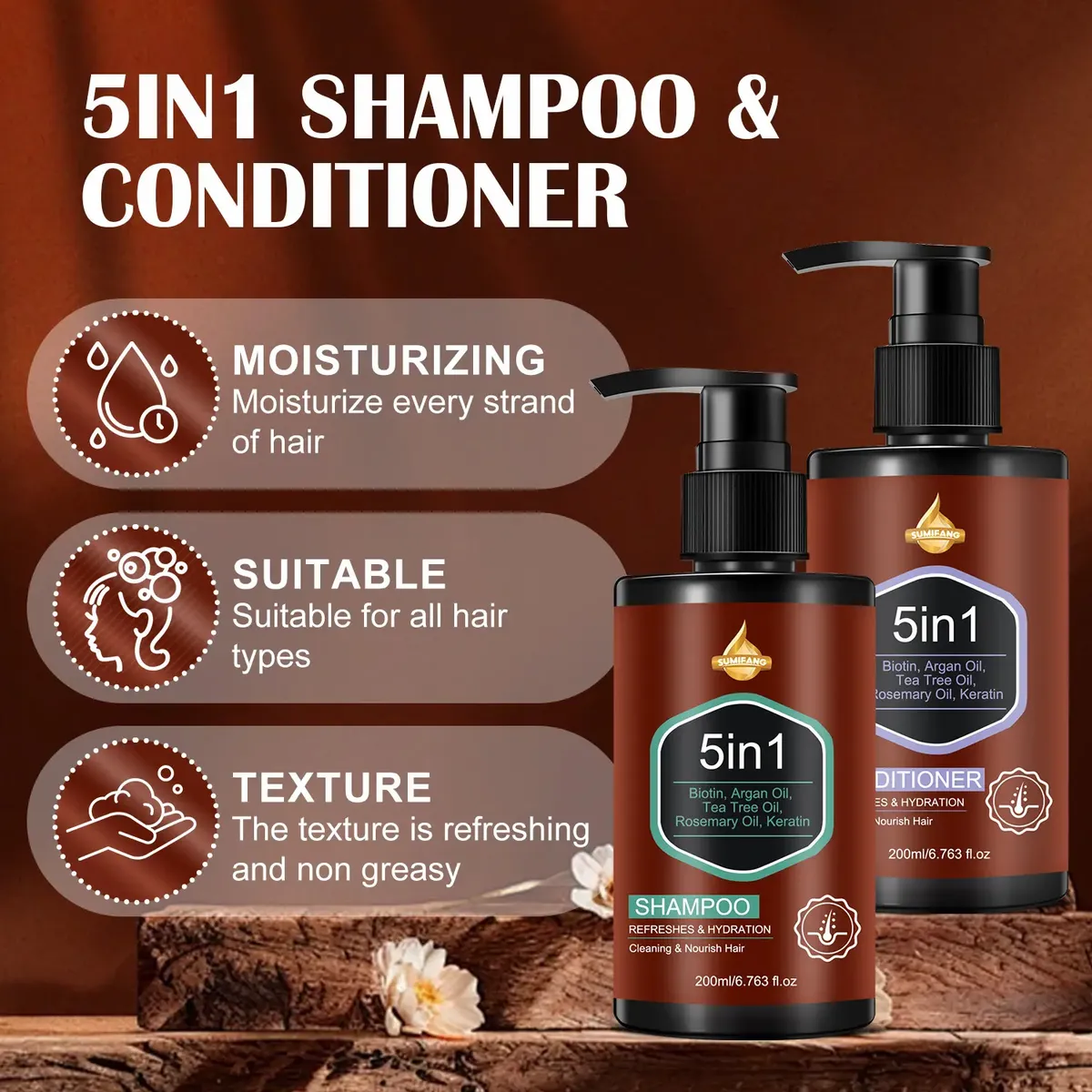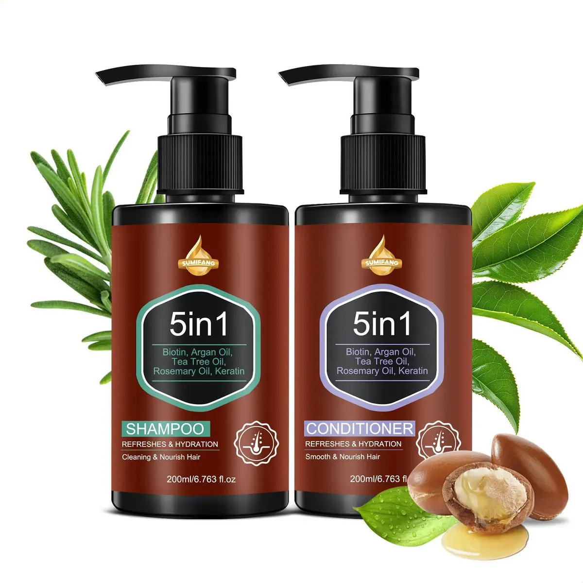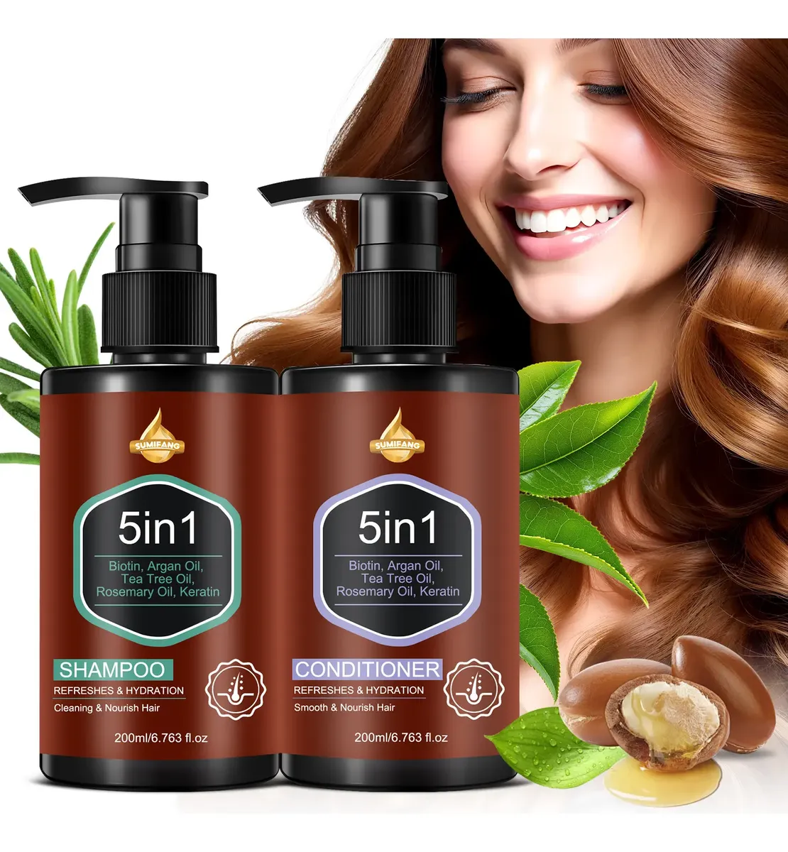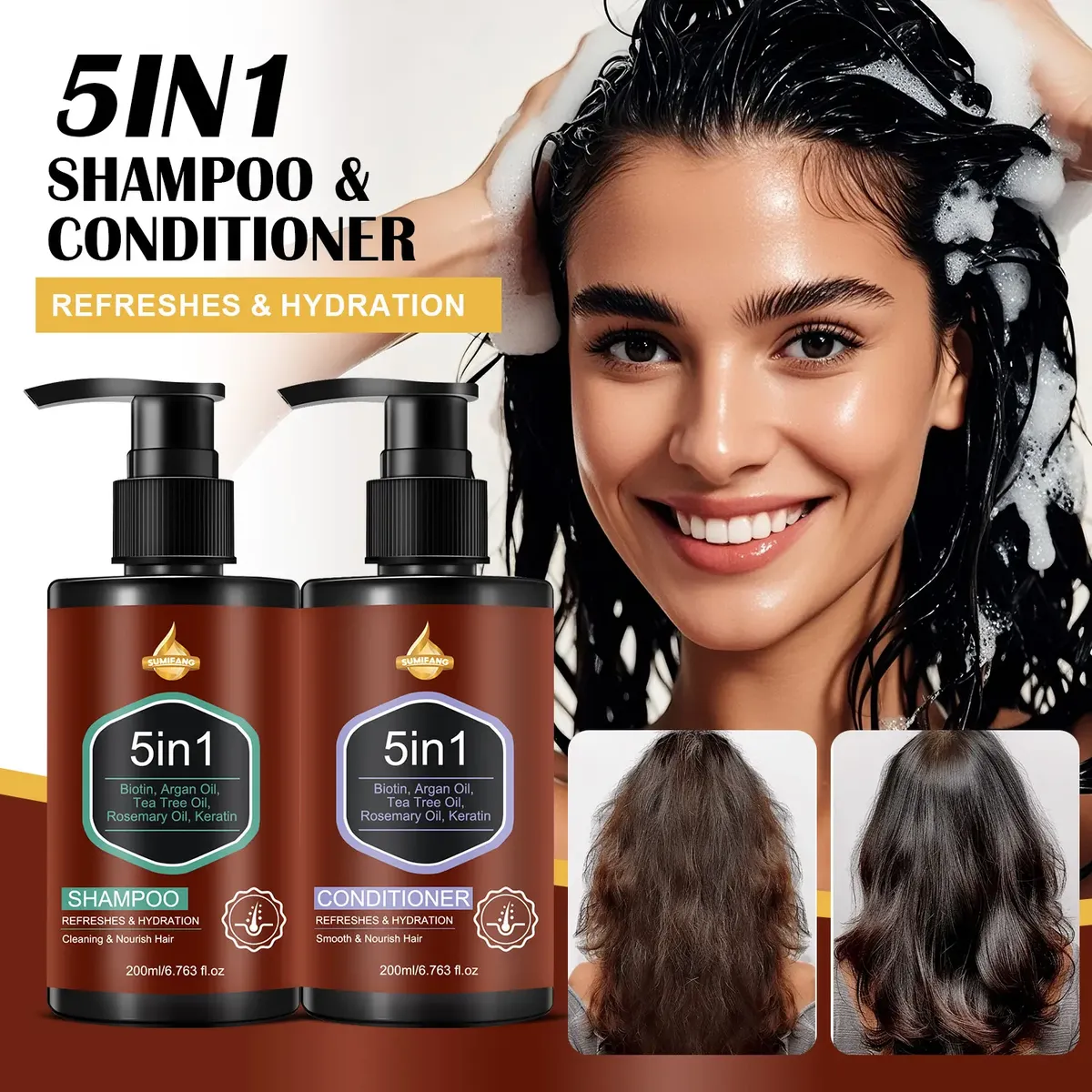Este kit contém 200ml de shampoo e condicionador com queratina. Combina os cinco ingredientes principais: biotina, óleo de argan, óleo de tea tree, óleo de alecrim e queratina para alcançar cinco efeitos em um só produto: limpeza, nutrição, hidratação, controle de oleosidade e rejuvenescimento. Desenvolvido para cabelos danificados, opacos e com falta de brilho diário. Infunde nutrientes profundos nos fios enquanto limpa o couro cabeludo. Reconstrói a estrutura capilar e melhora a resistência e o brilho. Deixa o cabelo macio, fácil de manejar e com aparência saudável após a lavagem.