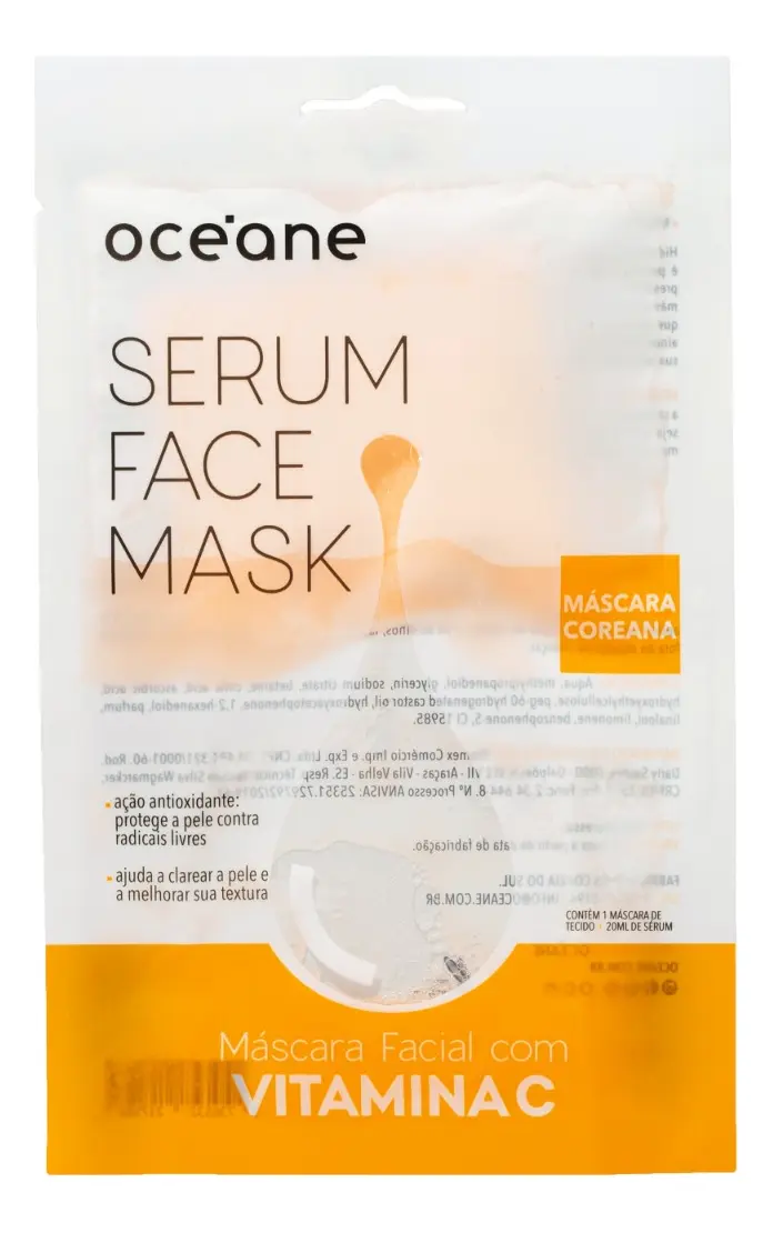 Descubra o poder revitalizante da Máscara Facial de Sérum com Vitamina C da Océane. Esta máscara de tecido é um verdadeiro elixir para sua pele, oferecendo hidratação profunda e auxiliando no clareamento de manchas, graças à sua fórmula enriquecida com Ácido Ascórbico, o poderoso antioxidante conhecido como Vitamina C. Sua consistência em creme garante uma aplicação suave e eficaz, enquanto ingredientes como Betaine e Glycerin promovem uma pele mais suave e nutrida. Ideal para pele normal, esta máscara é a aliada perfeita na sua rotina de cuidados, recomendada para uso semanal. Com um método de utilização inovador, basta virar a embalagem e pressionar para que o sérum seja absorvido pela máscara, preparando-a para um momento de tratamento exclusivo. Cada embalagem contém 20ml de produto, projetado para cobrir o rosto completo, proporcionando uma experiência de spa em casa. Faça da Máscara Facial com Vitamina C da linha Océane – Tratamento um passo essencial no seu caminho para uma pele radiante e sem manchas.