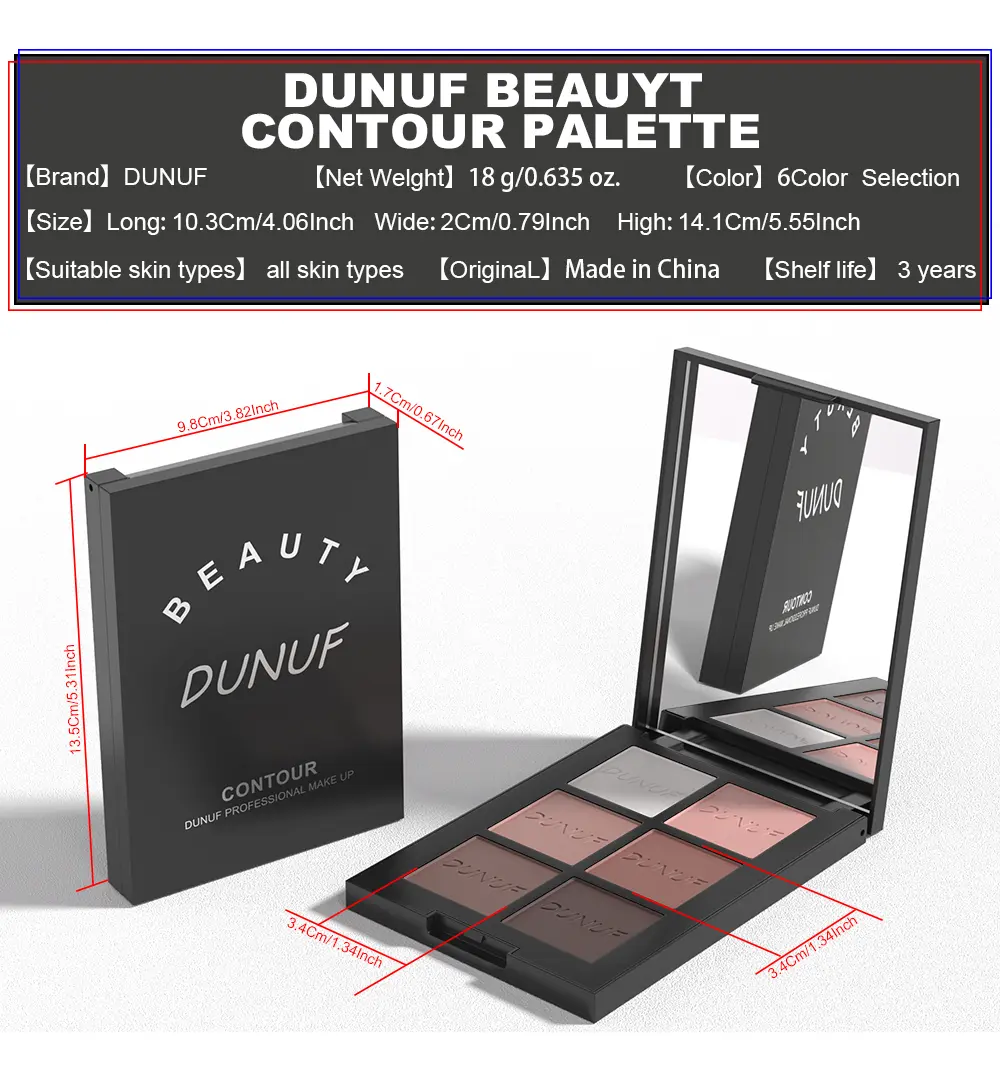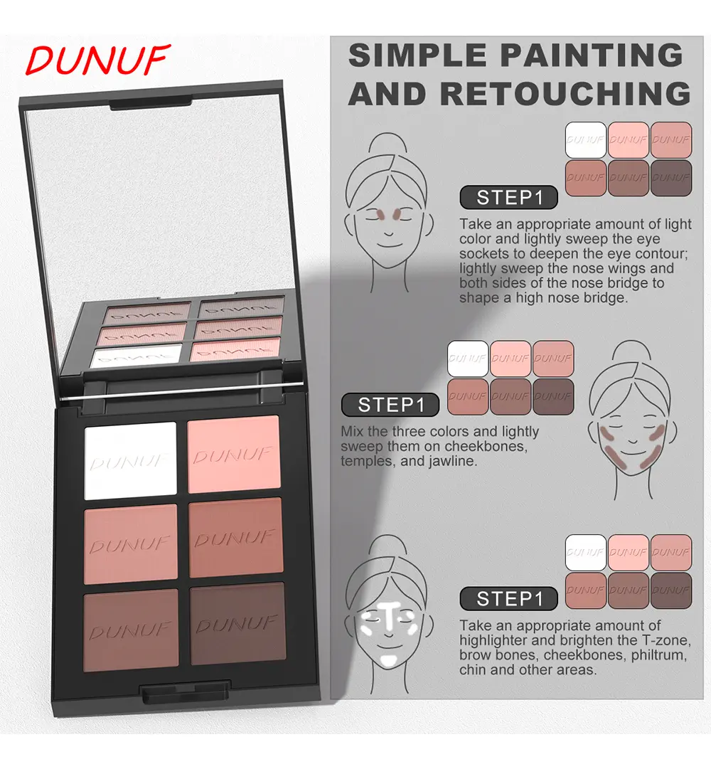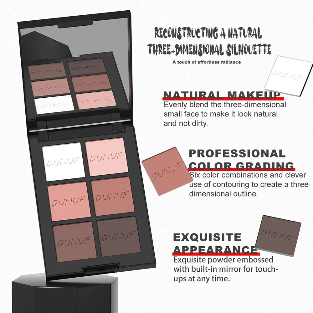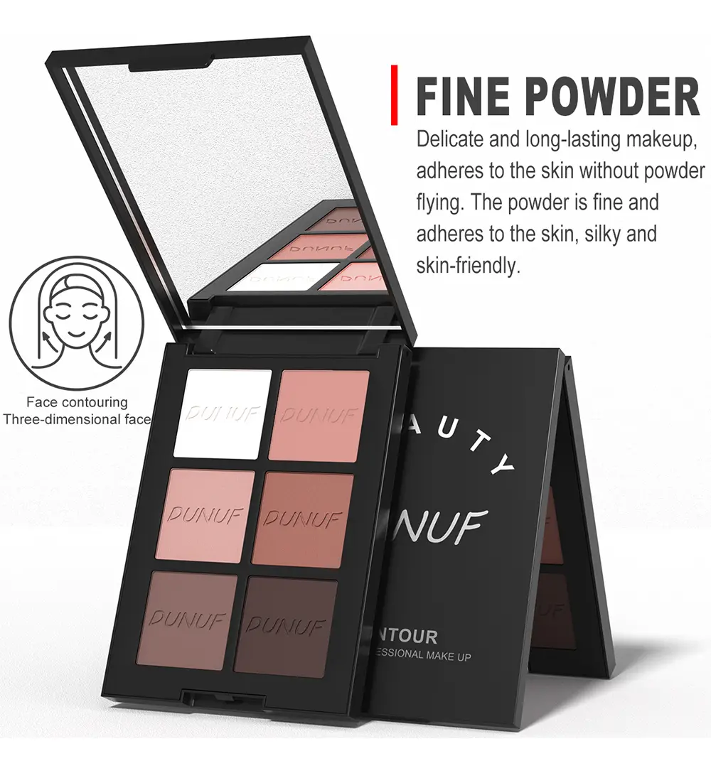 Descubra a Paleta de Contorno de 6 Cores Dunuf, a solução perfeita para realçar suas características naturais e criar looks diversos, do dia a dia ao mais glamouroso. Com um acabamento matte, esta paleta se adapta a diferentes tons de pele, proporcionando um resultado uniforme e sofisticado.