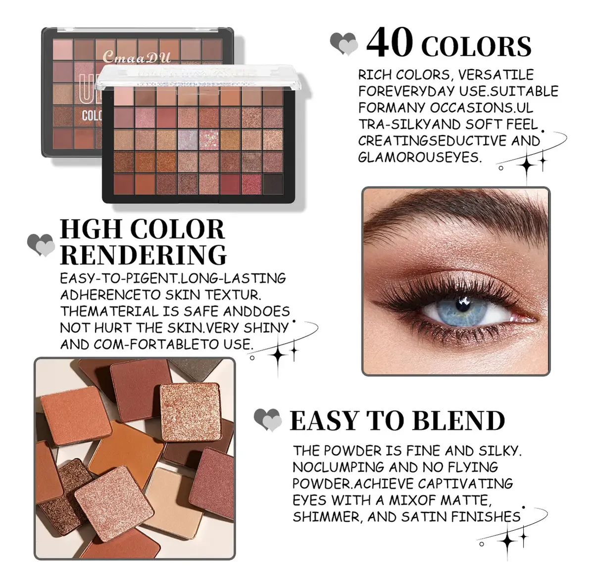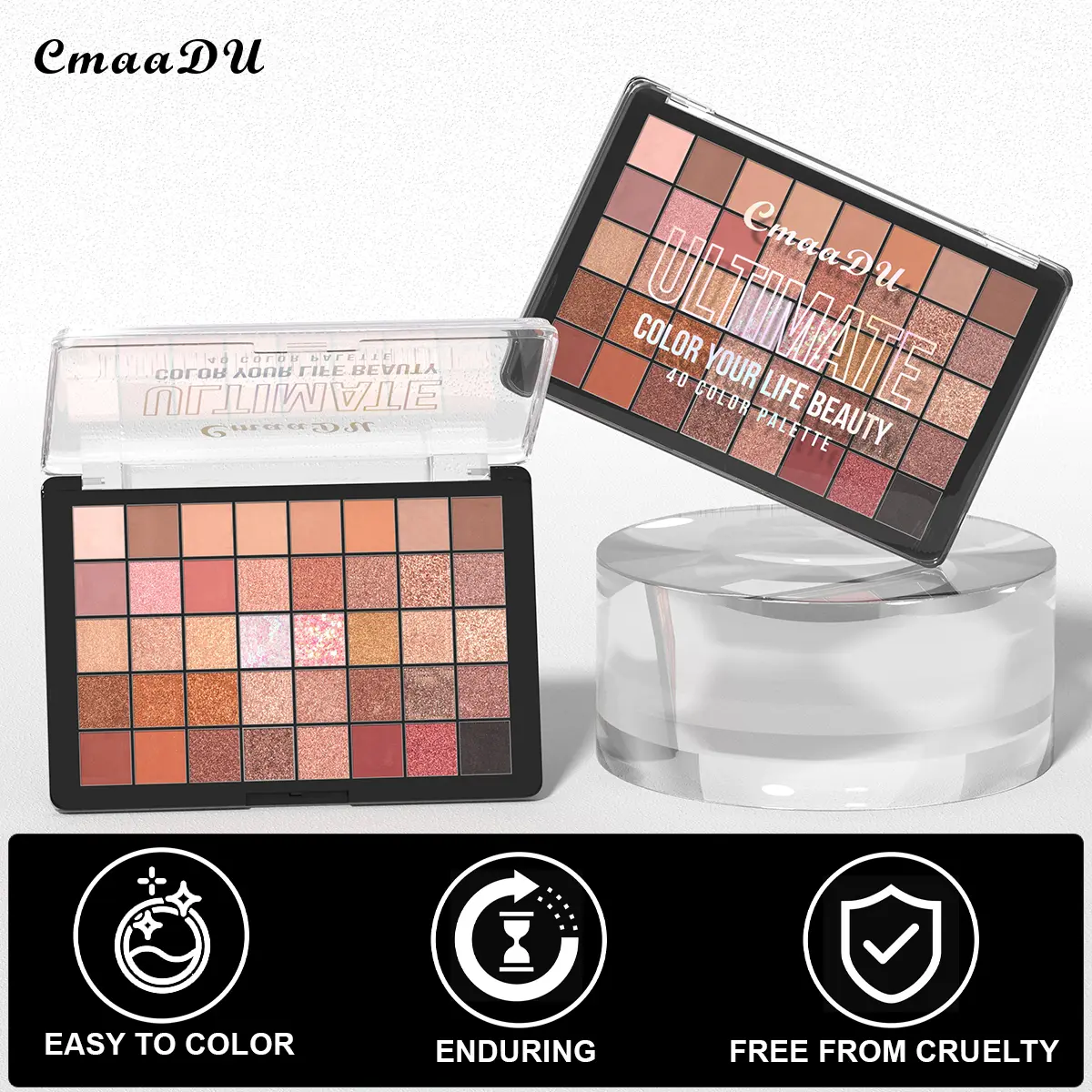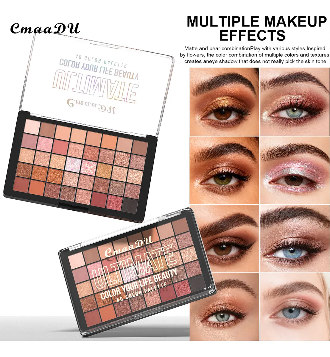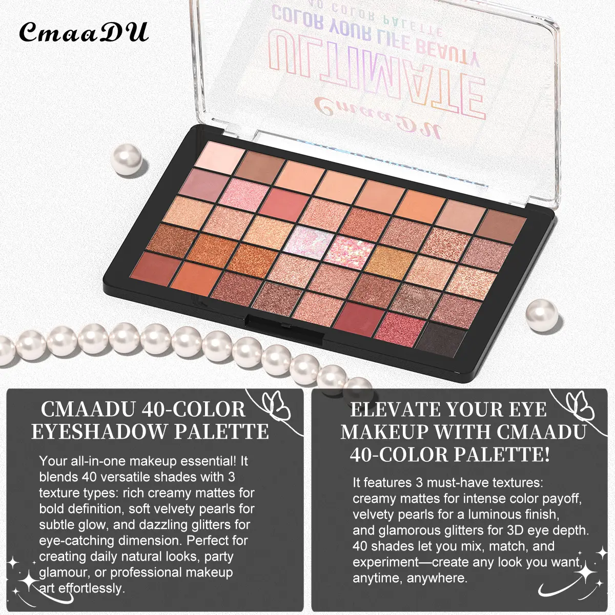 Paleta de sombras peroladas matte Fine Sparkling CMAadu de 40 cores. Rico em cores, sem grumos, sem pó solto, delicado, duradouro, fácil de aplicar, sem manchas, criando uma aparência encantadora e linda de maquiagem para os olhos. Cosméticos femininos, presentes para festivais.