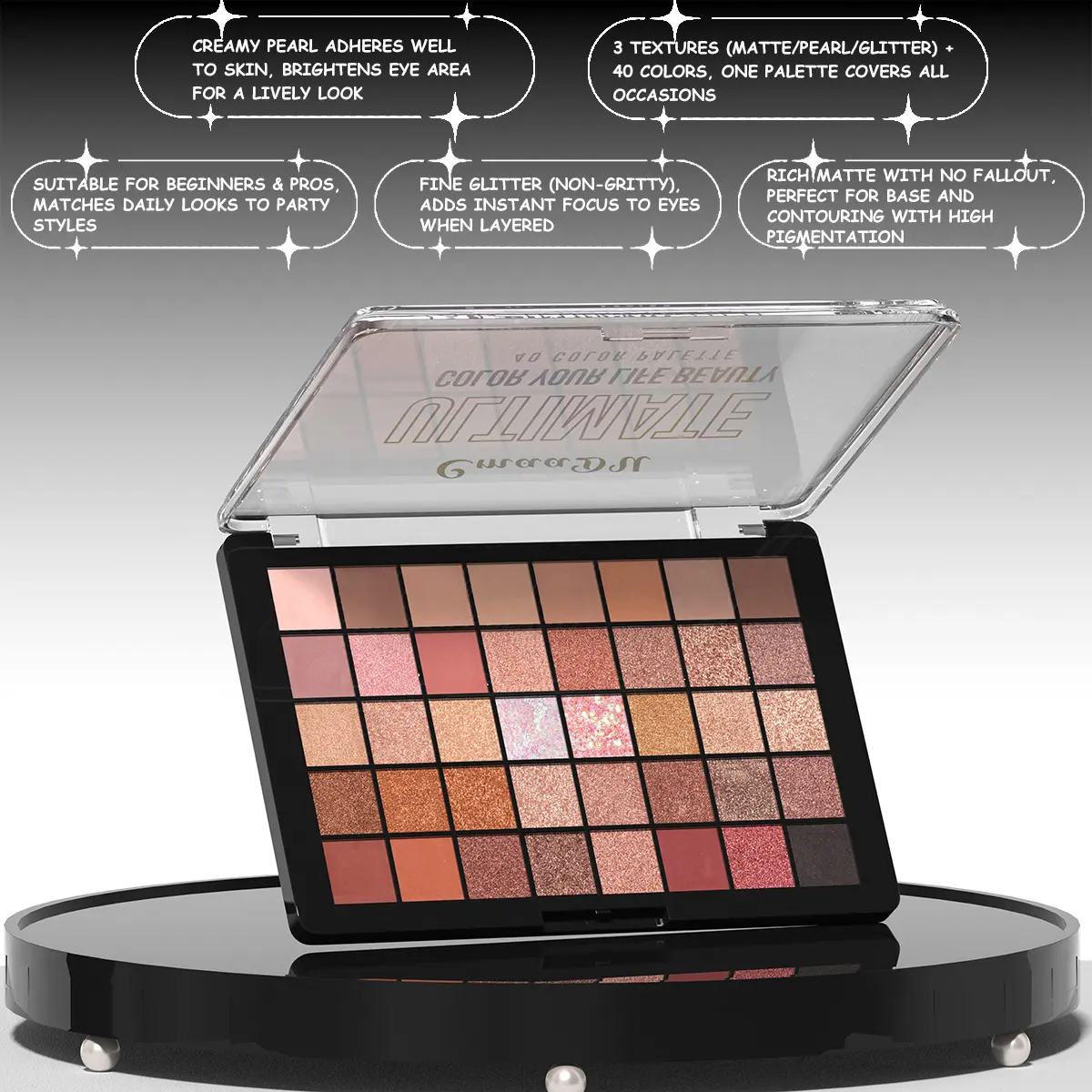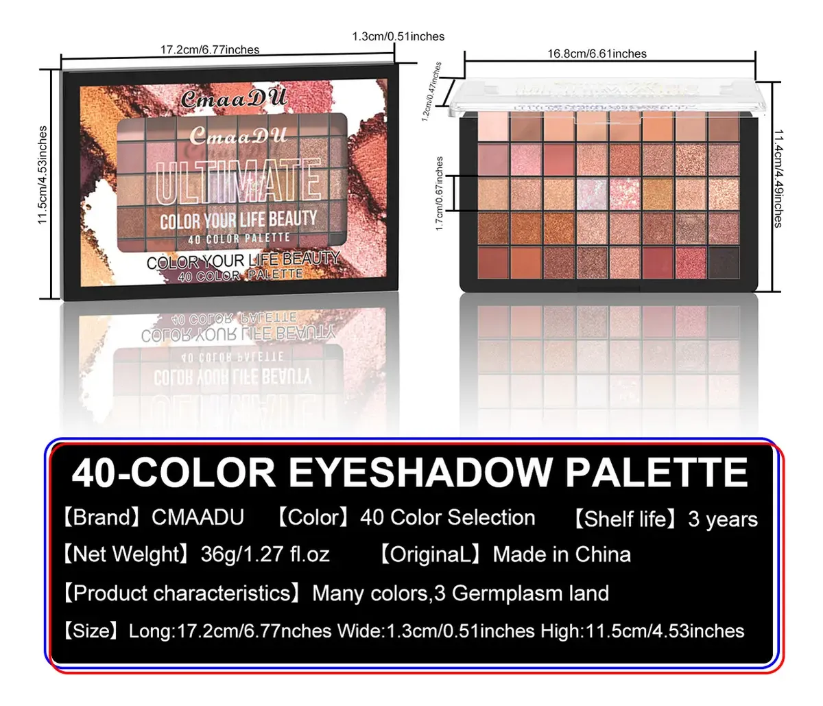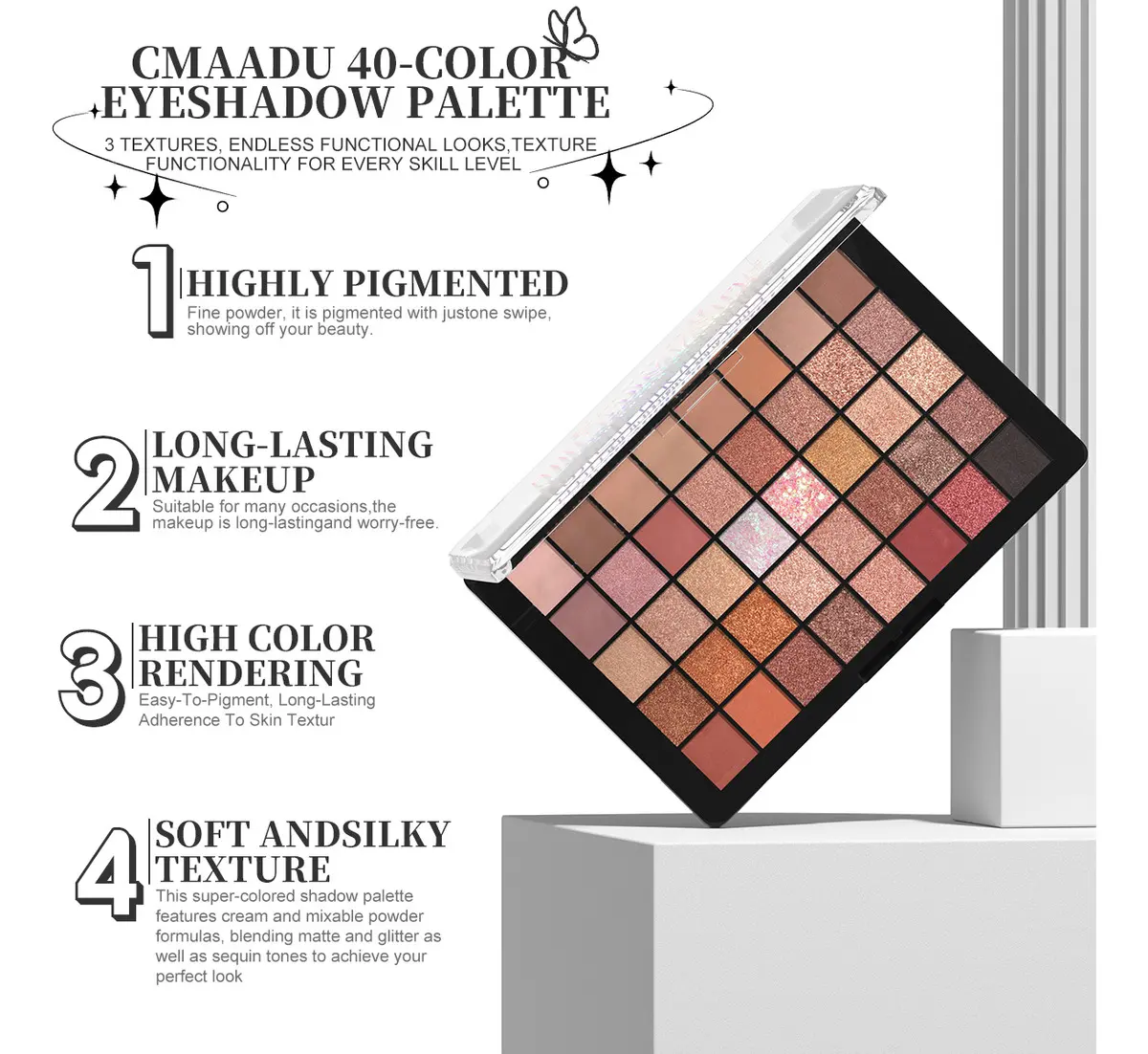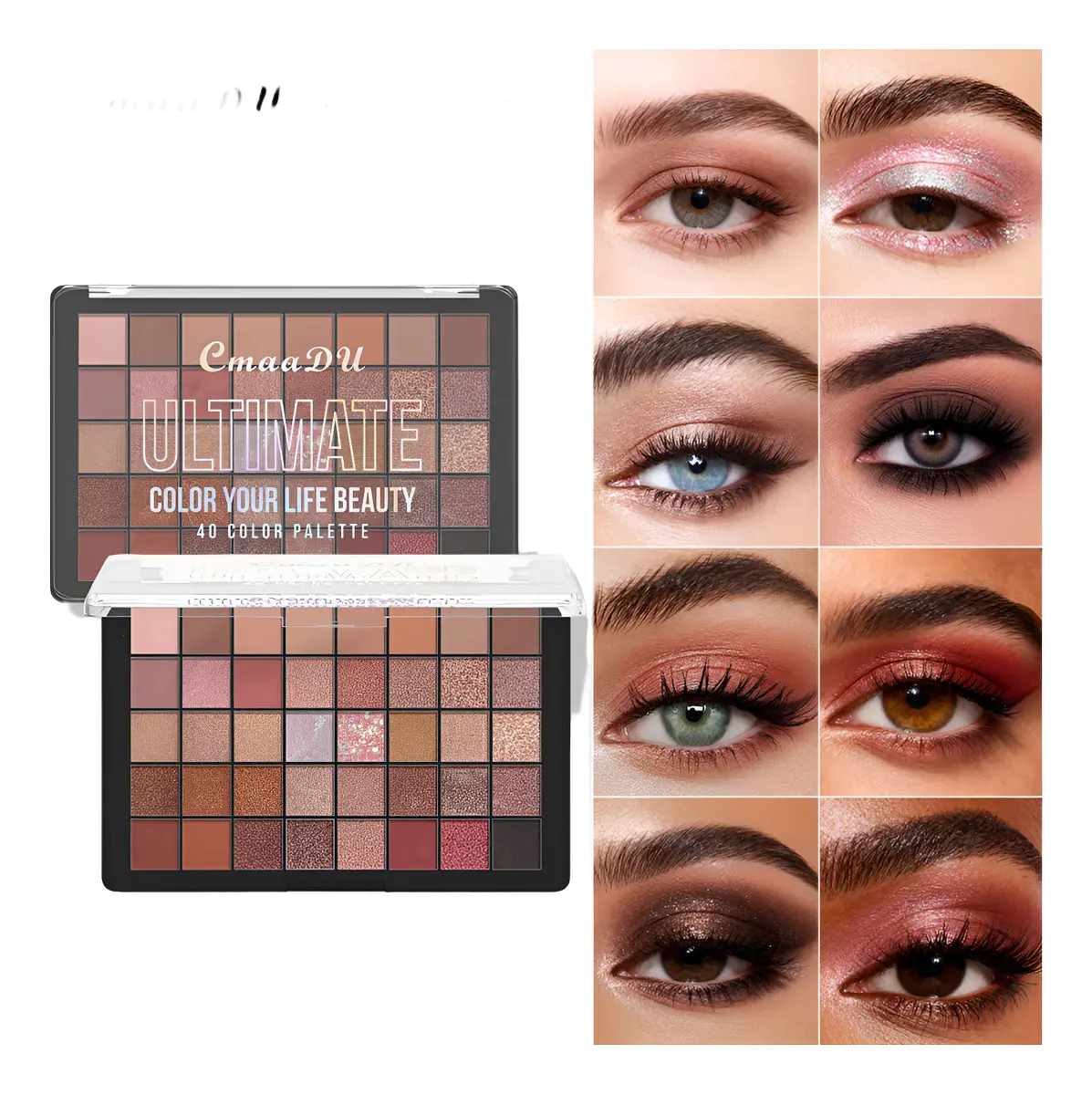 Paleta de sombras peroladas matte Fine Sparkling CMAadu de 40 cores. Rico em cores, sem grumos, sem pó solto, delicado, duradouro, fácil de aplicar, sem manchas, criando uma aparência encantadora e linda de maquiagem para os olhos. Cosméticos femininos, presentes para festivais.