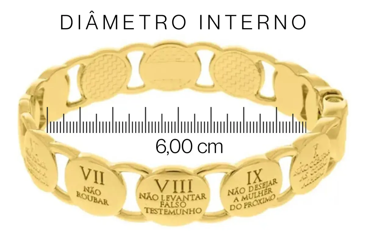 Com um design moderno e elegante, este bracelete traz os 10 mandamentos, simbolizando fé e espiritualidade em cada detalhe.