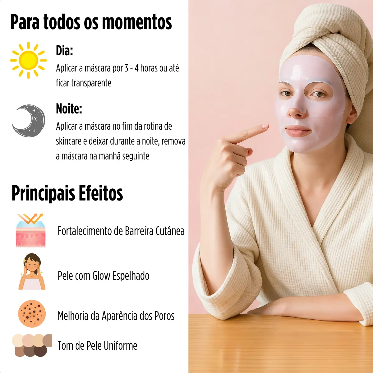 Sinta a transformação: pele com brilho de vidro, mais elástica, com poros visivelmente reduzidos e tom uniforme. Tudo isso com uma aplicação confortável e eficaz que se adapta à sua rotina — de dia ou à noite.