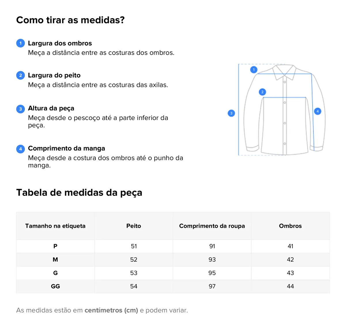 * As medidas informadas na tabela foram tiradas com a peça estendida sobre a mesa, de um lado ao outro. Pode haver uma variação de até 1 cm devido ao processo de fabricação.*