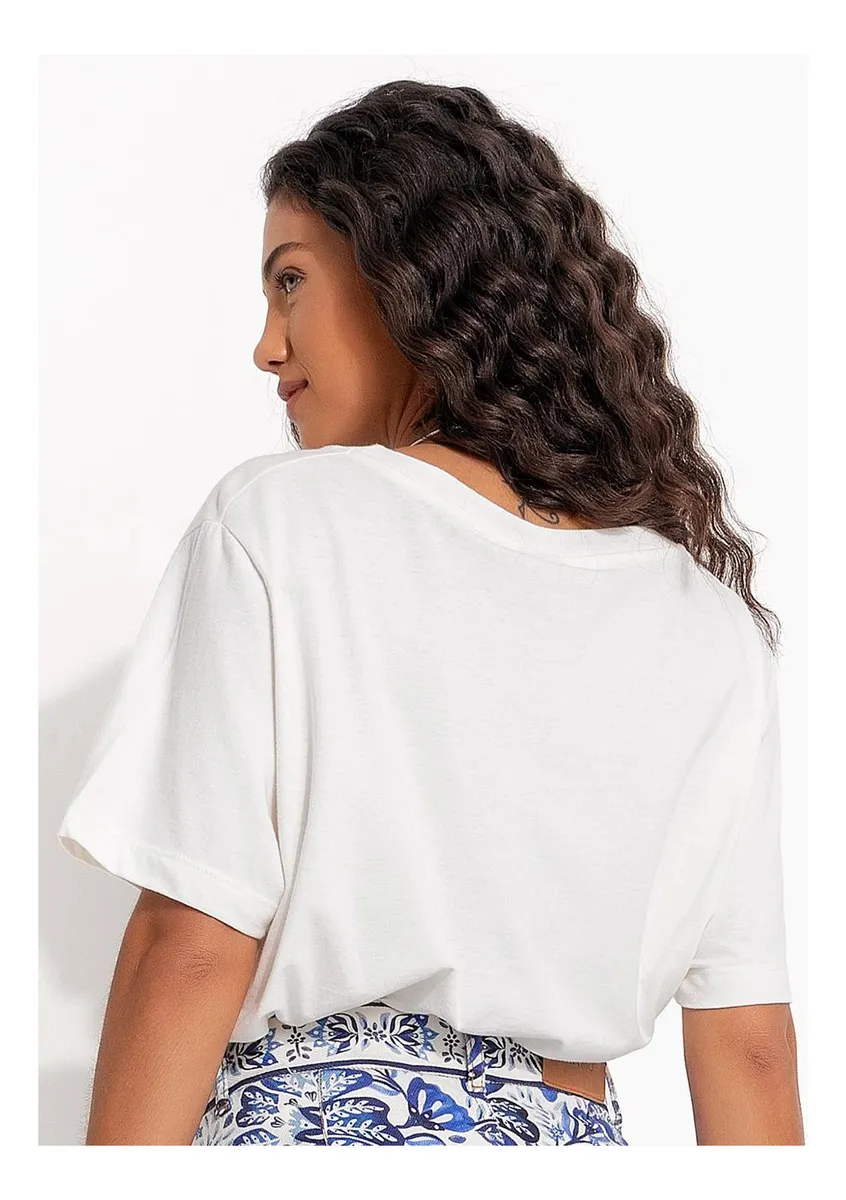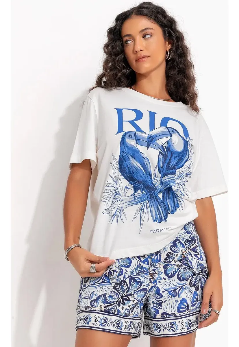T-shirt em malha de algodão com decote redondo, mangas curtas e modelagem confortável. Possui estampa exclusiva FARM Rio em tons de azul, que traz personalidade e estilo à peça.